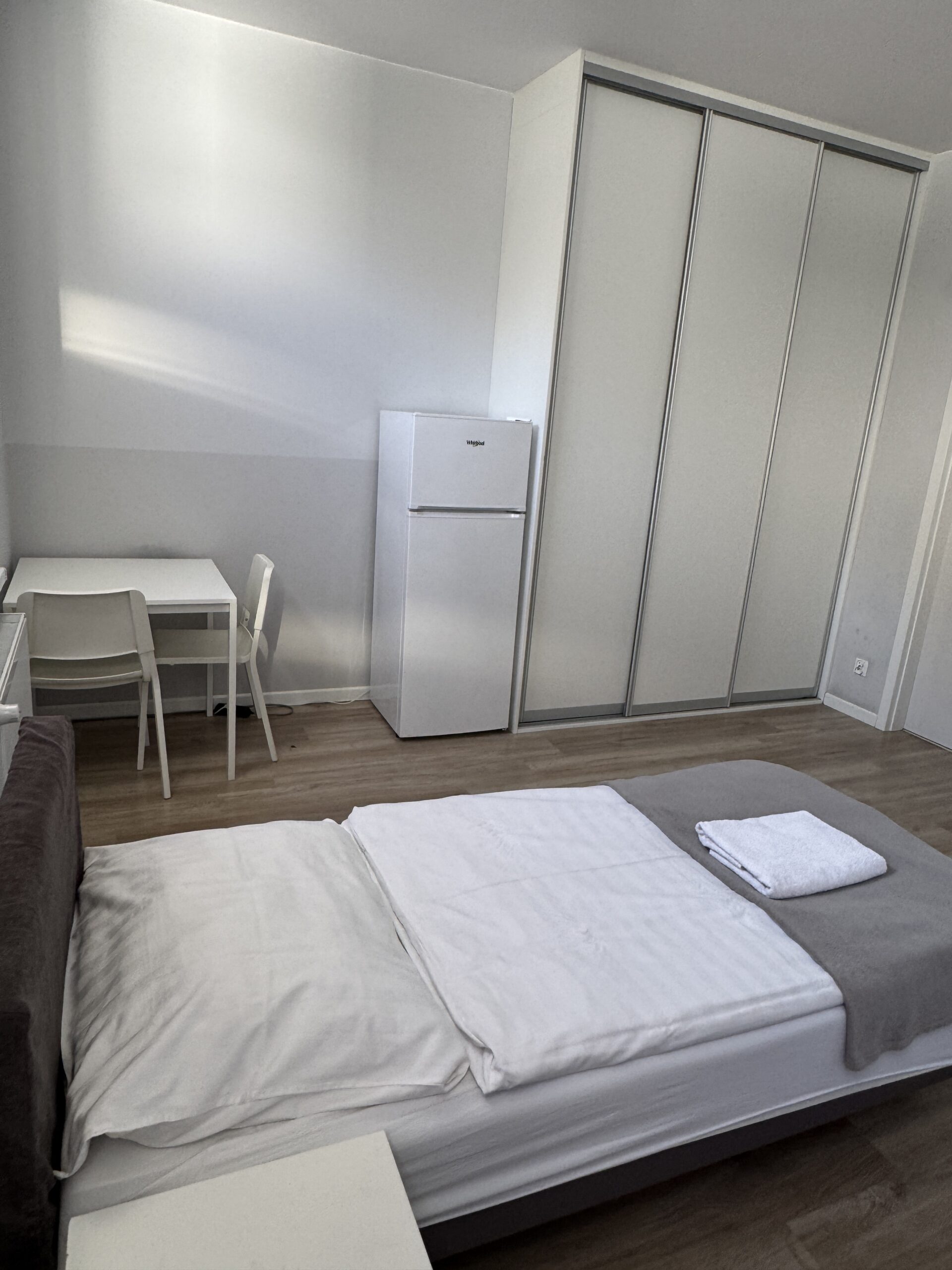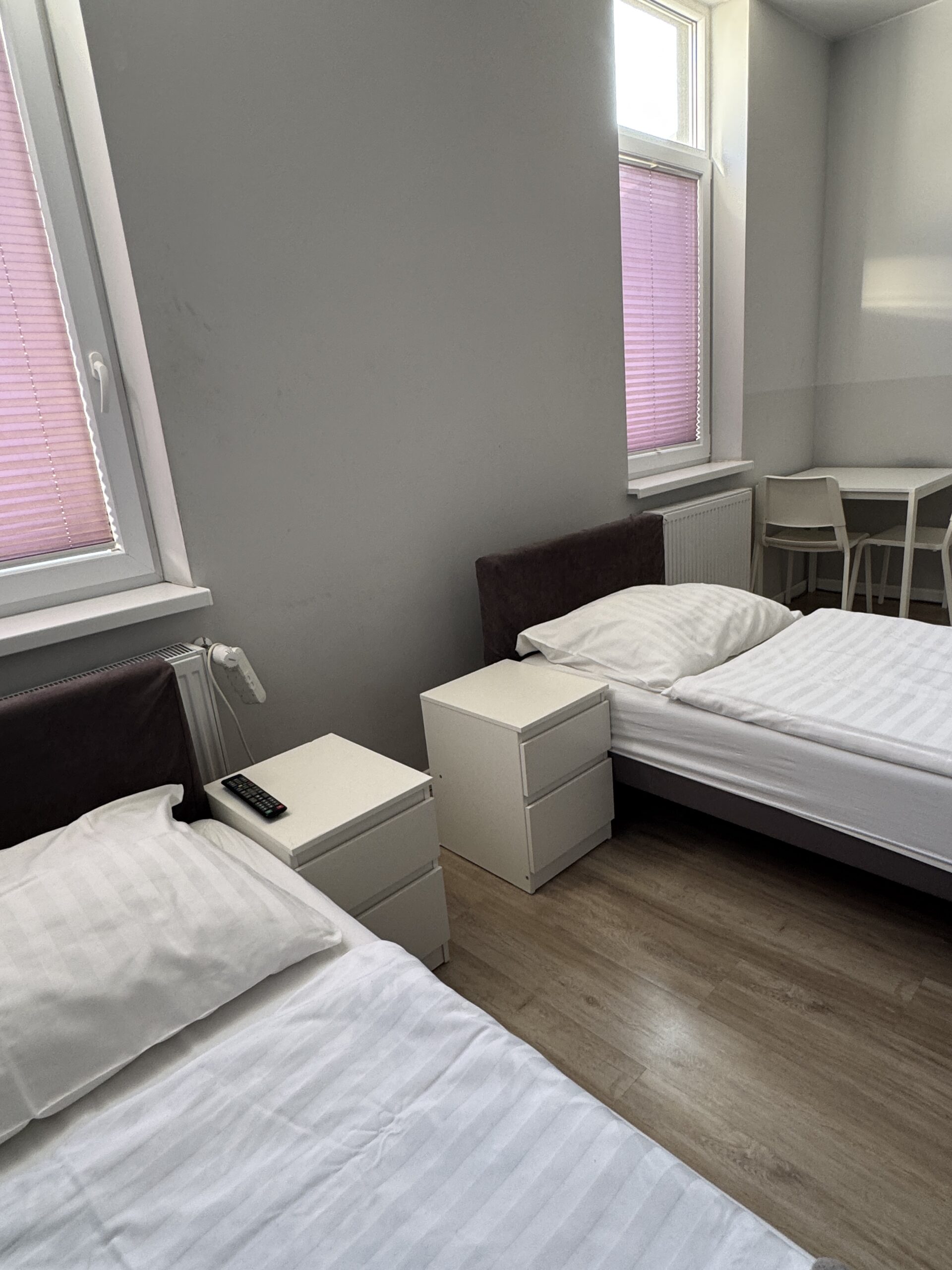 W pokoju znajdują się łóżka ręczniki, szafki nocne, szafa, stół krzesła, lampka nocna, lodówka, telewizor i łazienka z mydłem i papierem toaletowym, dostęp ogólnodostępnych do w pełni wyposażonych kuchni.